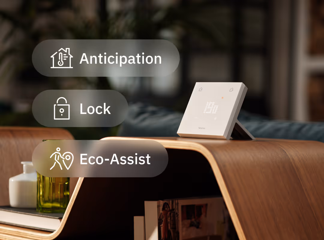 Benefit from features essential to your daily life. Anticipation: Heating starts at the right moment for an ideal temperature. Lock function: Prevent accidental changes on the Thermostat. Eco-Assist (geolocation): Receive an alert if you leave without lowering the heating.