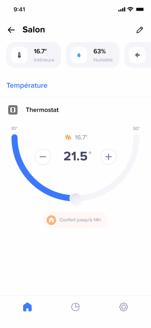 From the Thermostat screen, start two customizable Home scenarios. For example, activate "Departure" to lower overall heating during your absence. And if your home is equipped with other connected products³, control them with a single gesture.