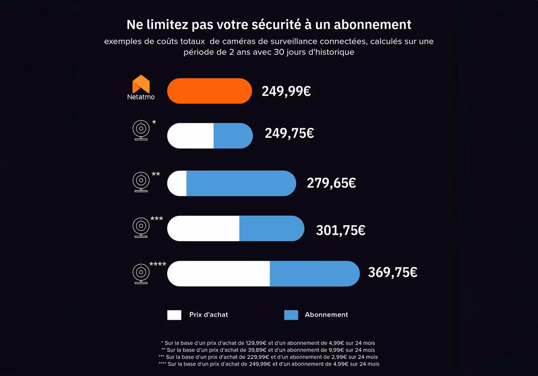 Enjoy all features without any additional fees or subscription. Le stockage des vidéos et toutes les fonctionnalités sont accessibles à tout moment. Your Camera grows with you over the years, with features and regular updates, all for free.