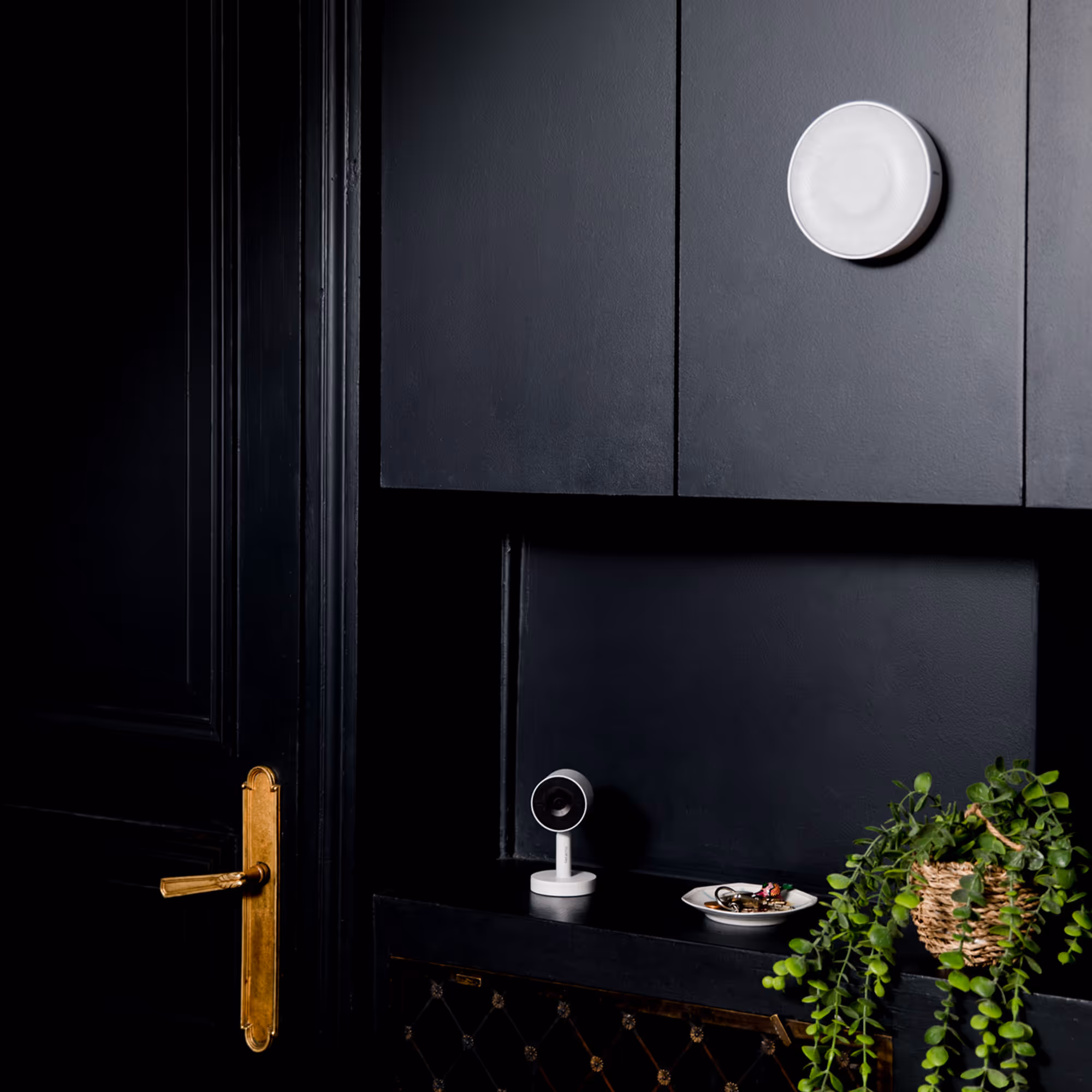 Disposez la Caméra Intérieure face à votre porte d'entrée, puis branchez-la et connectez-la au Wi-Fi. Collez les Détecteurs d’Ouverture sur vos portes et fenêtres, puis connectez-les à la Caméra Intérieure. Enfin, placez la Sirène sur un meuble ou au mur, puis suivez les instructions de l’application. Et voilà, vous êtes protégé·e·s !