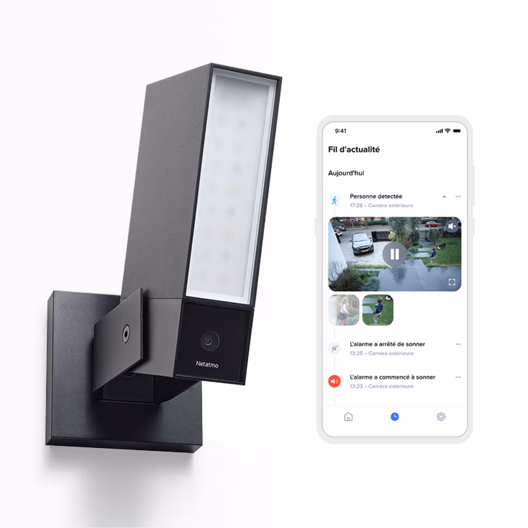 La Caméra Extérieure Intelligente avec Sirène est équipée d'une alarme : une Sirène Extérieure intégrée, la Caméra Extérieure Intelligente n'en possède pas. Toutes les autres fonctionnalités de la Caméra Extérieure Intelligente comme par exemple : le luminaire extérieur, le détecteur de mouvements, la vision nocturne (15 mètres), l'installation facile (kit d'installation inclus avec les Caméras), les alertes en temps réel, la qualité d'image, la résistance aux intempéries etc. sont similaires à celles de la Caméra Extérieure Intelligente avec Sirène (sauf l'alarme citée ci-dessus). Chacune de ces Caméras est compatible avec Amazon Alexa, Google Assistant et Apple HomeKit. Ces deux caméras de surveillance sont disponibles avec la livraison offerte sur la boutique Netatmo, les prix TTC conseillés des deux produits sont également différents.